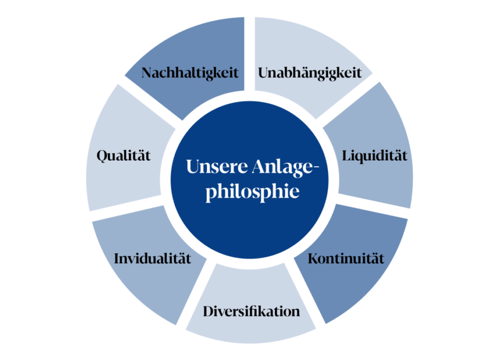Bei der Entwicklung Ihrer persönlichen Anlagestrategie berücksichtigen wir Ihre Vermögenssituation, aktuelle und künftige Verpflichtungen, Ihr Risikoprofil und Ihre Renditeerwartungen. Dabei streben wir stets nach Qualität, Kontinuität, Unabhängigkeit, Individualität, Liquidität und Diversifikation. Zudem steht das Thema Nachhaltigkeit für uns auch beim Investieren im Fokus.